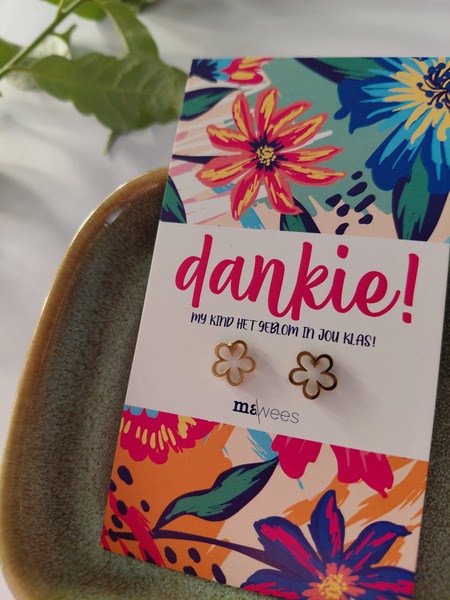 Hierdie pragtige vlekvrye staal oorbelletjie kom op 'n prettige kaartjie met woorde wat lui: "Dankie my kind het geblom in jou klas"